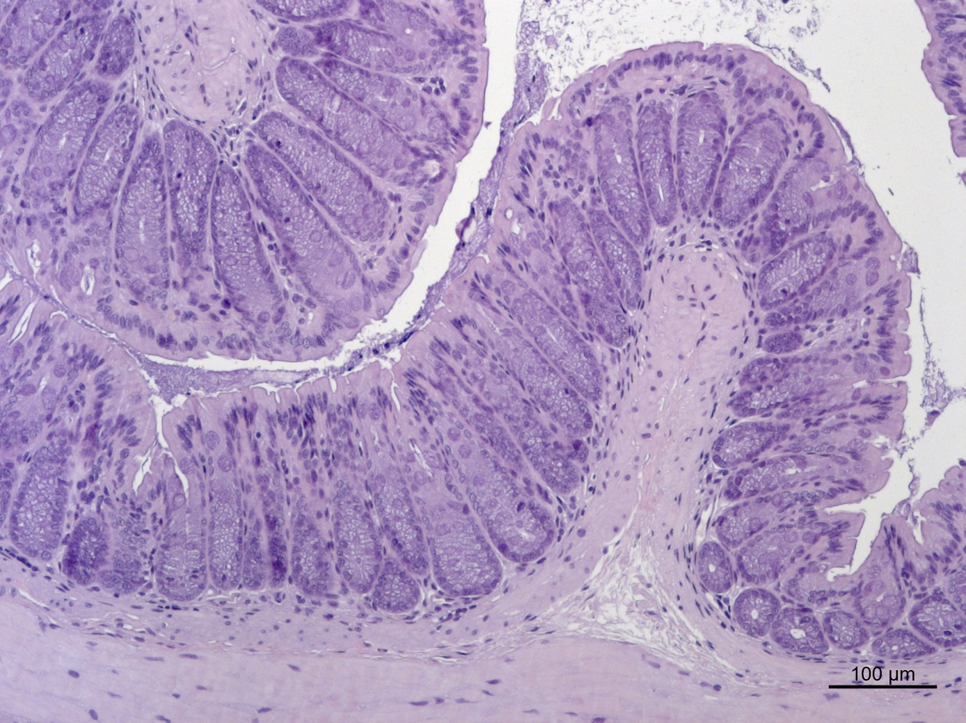 Das Bild zeigt Darmgewebe aus einem Mausmodell für die erworbene generalisierte Lipodystrophie. Das Gewebe blieb auch nach der Behandlung mit einer Chemikalie, die normalerweise eine Darmentzündung auslöst, intakt.
